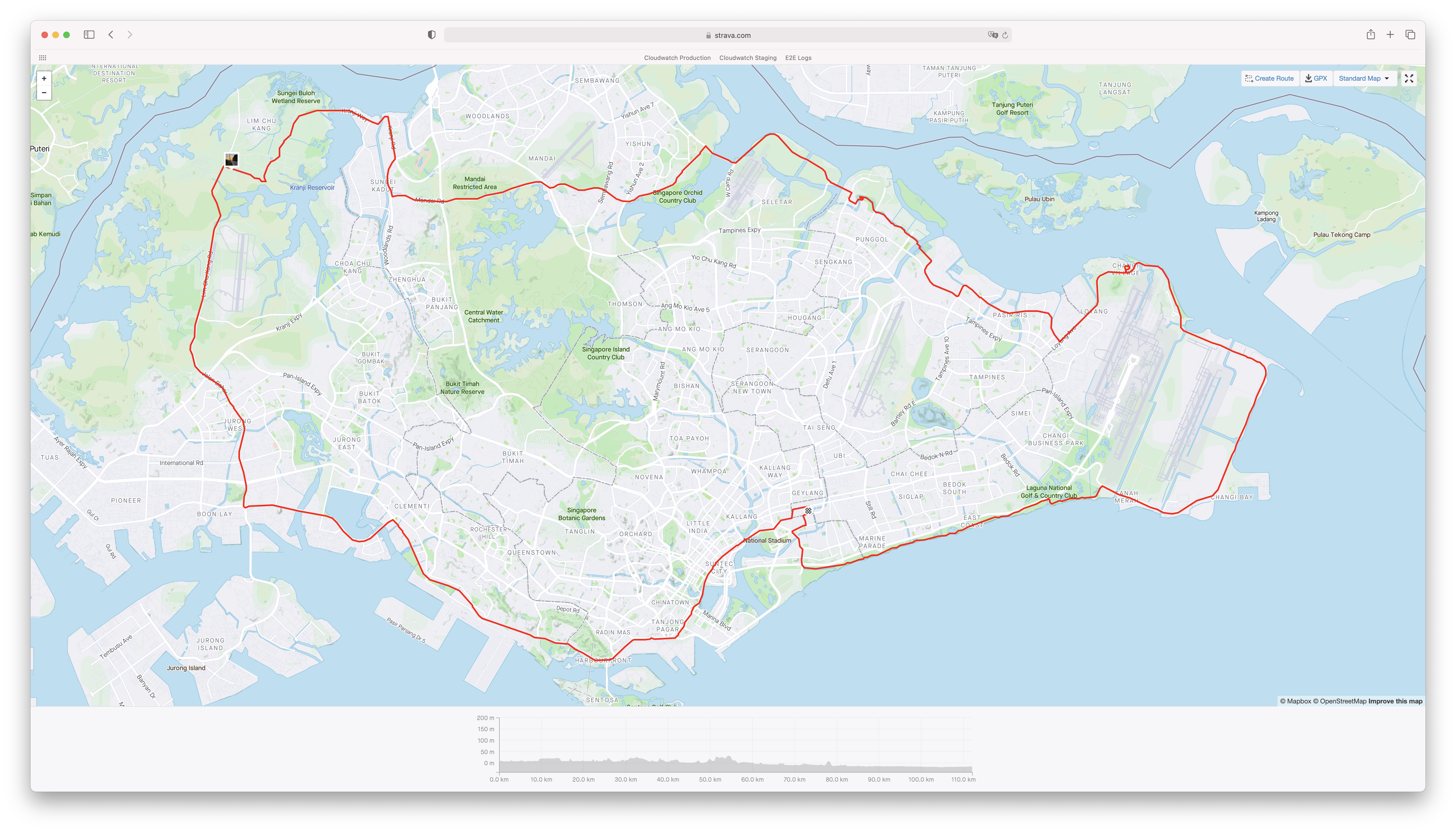 เส้นปั่นรอบเกาะสิงคโปร์ที่นี่จะมีความยากอยู่ประมาณสามระดับ ง่ายสุดคือปั่นไปทางตะวันตกแล้วตัดขึ้นเหนือตรงแถว NUS เลยจะตัดขึ้นตรงถนน South Bouna Vista แล้วเลี้ยวมา Clementi ตรงถนน Dover ก็ได้หรือจะตัดขึ้นตรงเส้น Clementi เลยก็ได้ยากคนละแบบ เส้นนึงเป็นเนินขึ้นทีละน้อยๆ 1 - 2% แต่ยาวหนึ่งกิโล ส่วนอีกเส้นเป็นเนินสองลูกชันสองลูก 3 - 4% แต่สั้น จากนั้นปั่นขึ้นไปจนถึง Mandai ประมาณ 20 กิโลเมตร ตลอดทางก็มีเนินขึ้นลงอีกประมาณ 4 - 5 ลูก แล้ววิ่งไปทาง Mandai ผ่าน Yishun, Seletar airport, Punggol, Pasir ris, Changi Villang, Tarah Merah Coast road, East coast park แล้วกลับมาในเมือง รวมระยะทางแล้วประมาณ 100 กิโลเมตร เป็นระดับที่ง่ายสุด